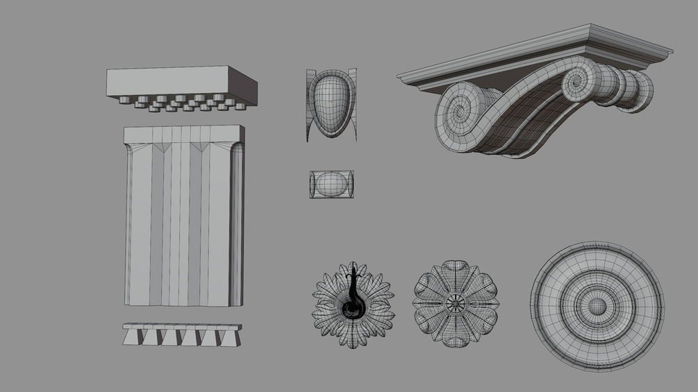 Frieze models can work modularly. Models are not UV unwrapped and are untextured. Face count does not include frieze's and pedestals.